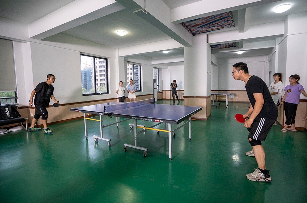 公司自建生活小區(qū),員工宿舍有套房(兩室一廳)、單人間以及集體宿舍等不同房型,房間內(nèi)設(shè)空調(diào)、熱水淋浴、衣柜、床鋪等設(shè)施,滿足員工基本需求。生活小區(qū)還提供閱覽室、籃球場、臺(tái)球室等,并緊鄰?fù)醯昝繁惫珗@,給臺(tái)華家人們提供不同的休閑方式。